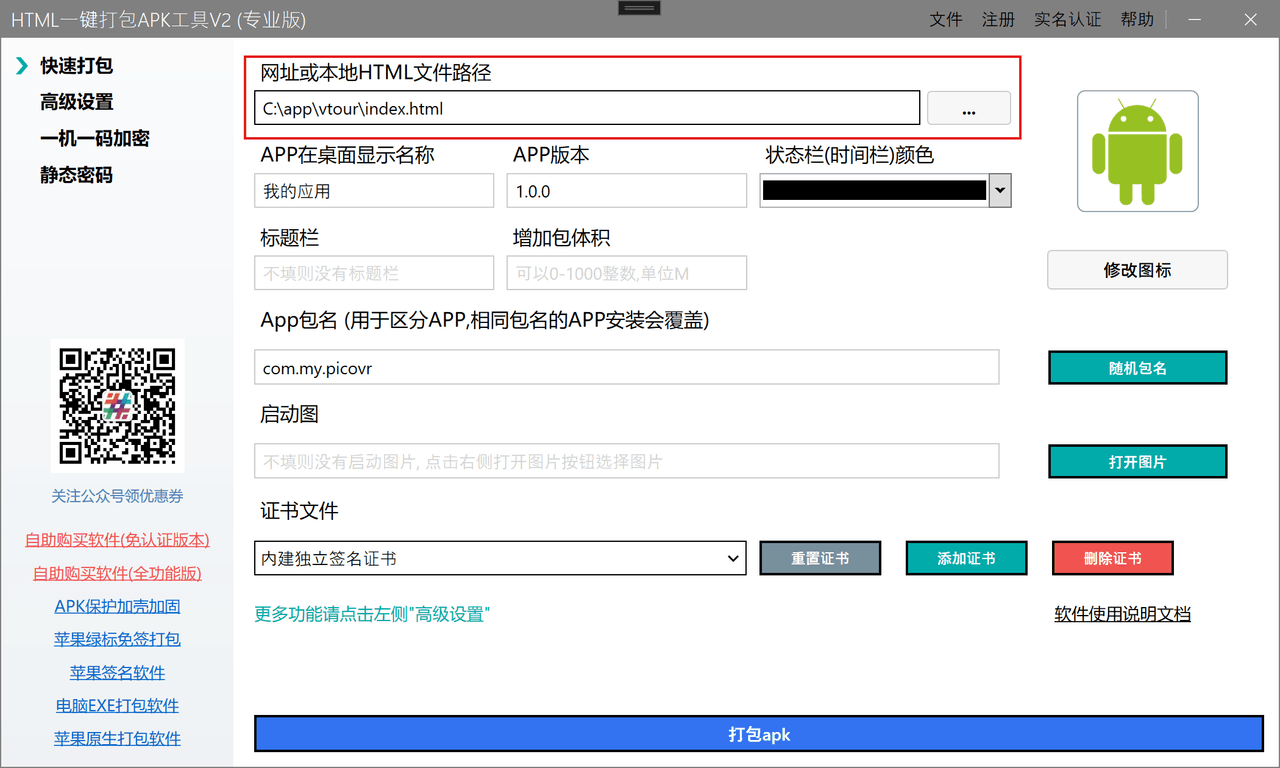 根据需要调整其他配置(如包名、版本号、图标等),完成后点击“打包”生成 APK 文件。