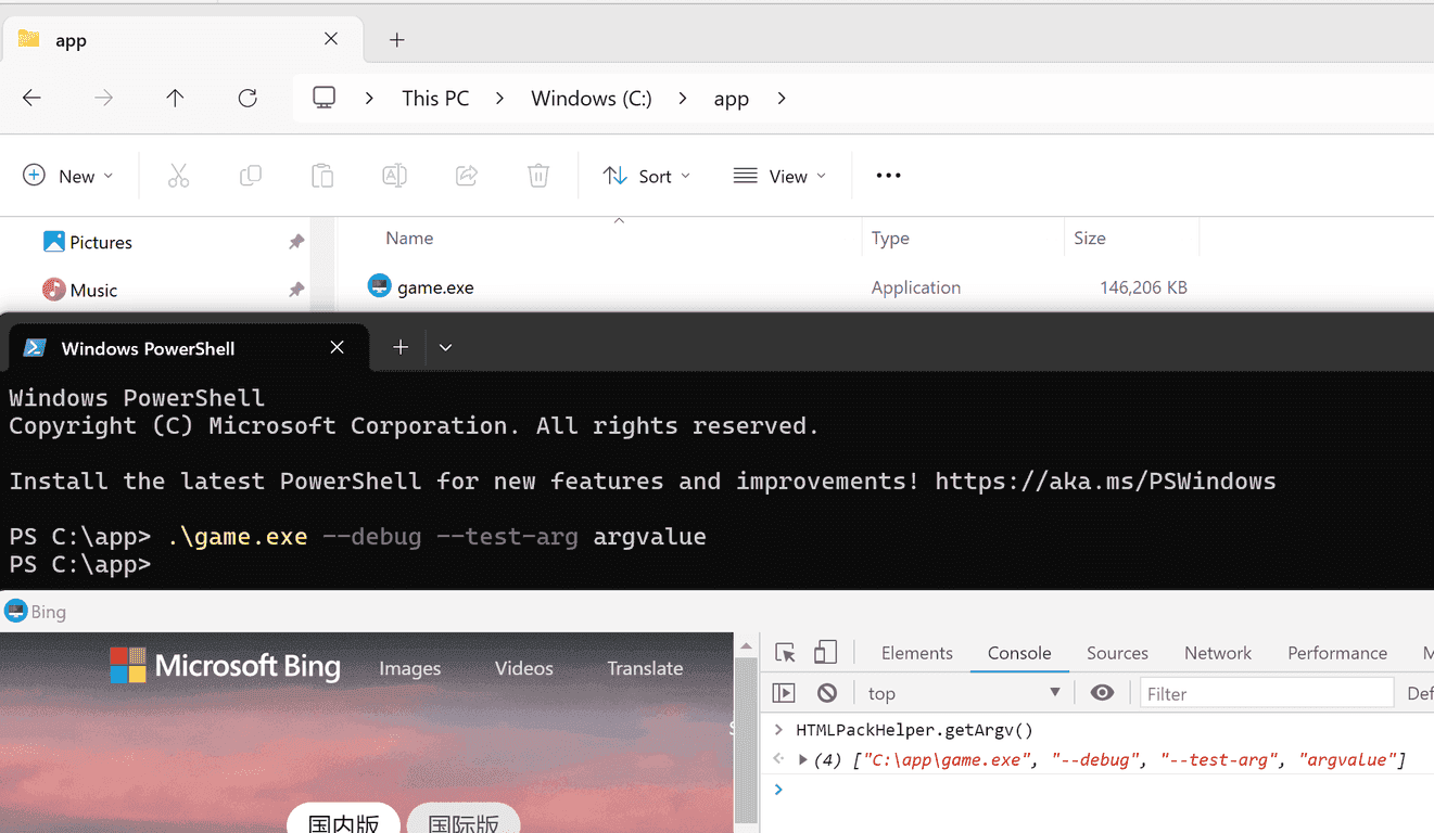 返回结果为数组,其中第一个值为当前 EXE 所在路径,后续值为启动 EXE 时传入的命令行参数。示例图: