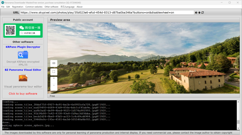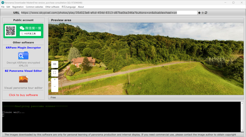 Enter the URL of the panorama you want to download and press Enter: For example: https://www.skypixel.com/photos/play/35d023e6-efcd-454d-8313-d87ba0ba346a?buttons=on&disablewheel=on